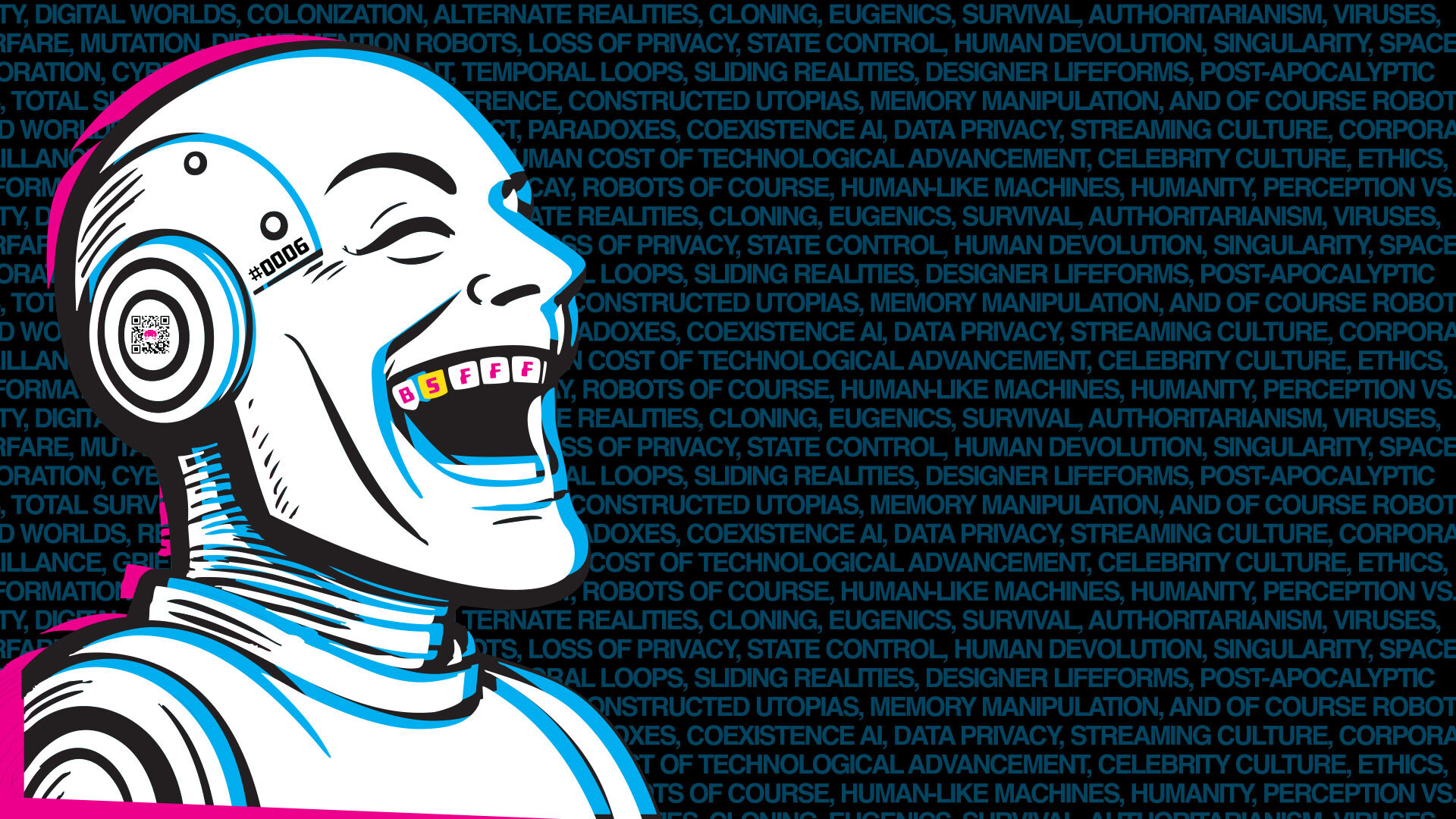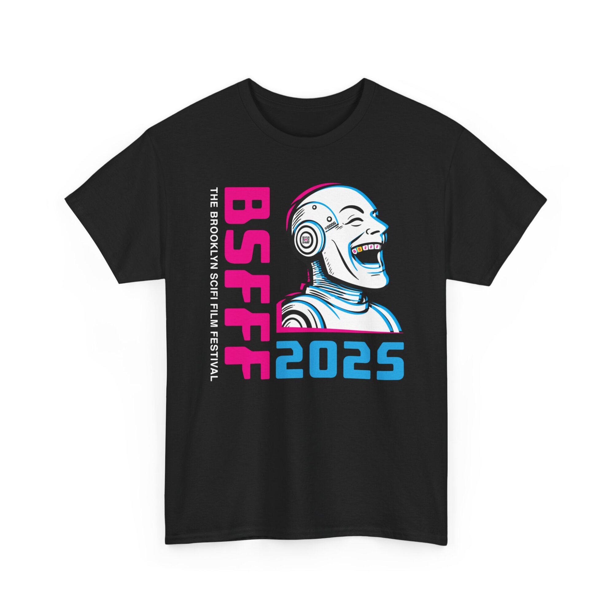 The new 2025 Brooklyn SciFi Film Festival t-shirt is now available for a limited time, featuring this year's manic robot color print on the front-side and festival logo with a full listing of all 180 film selections on the back. Check out all the color selections and festival merch now available online before they're gone for another year!